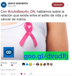 cáncer de mama 22/06/2017 < Anterior Julio Basulto2017-06-22T12:48:57+02:0022/06/2017| Comparte esta noticia! FacebookXRedditLinkedInTumblrPinterestVkCorreo electrónico